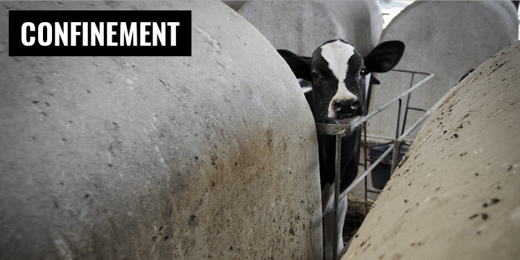 Calves used for veal are often kept in small areas to prevent them from developing too much muscle.