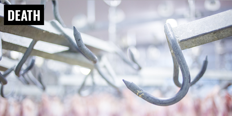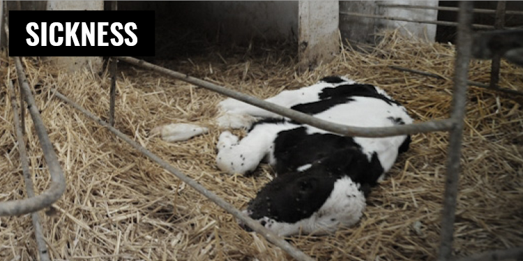 Calves used for veal have been taken from their mothers, so they are given formula food. This formula is lacking in needed nutrients which prevents them from healthy growth. Meanwhile, mother cows are milked for human consumption. In this photo, a calf has died in his veal crate on a dairy farm.