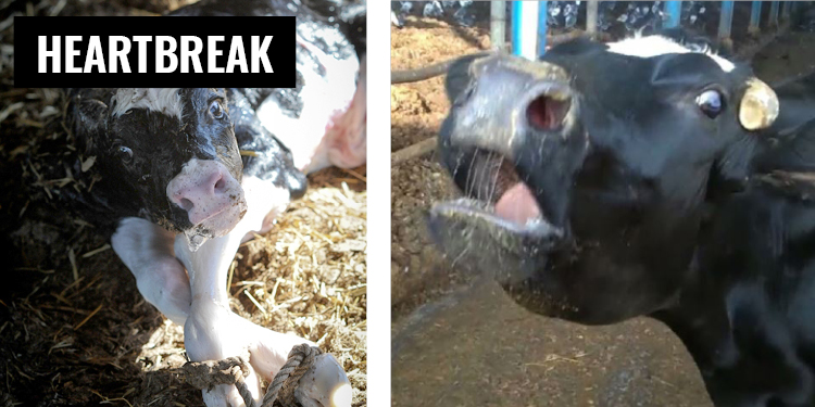 Generally, within a day of being born, calves are taken from their mothers so that their milk can be used for humans. Both mother and baby cry for each other.