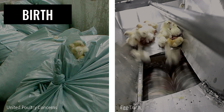 When chicks hatch on a factory farm, they are immediately brought into a world of fear. Generally, within a day of being born, chicks are sorted by sex. The males are killed en masse (usually ground up alive or suffocated to death) and the females begin their difficult lives producing far more eggs than is natural.