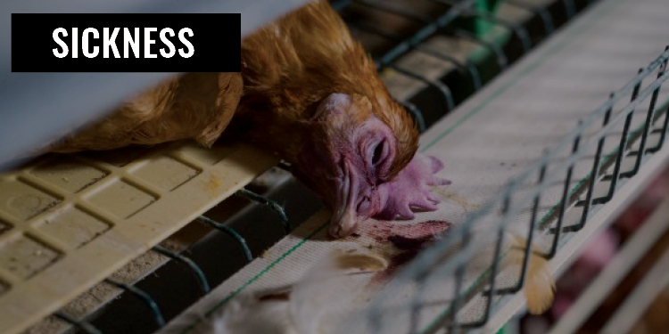 Because chickens used for eggs are crammed so closely together, these normally clean animals are forced to urinate and defecate on one another. Chickens who have succumbed to disease are left to be trampled by others as they struggle for space.