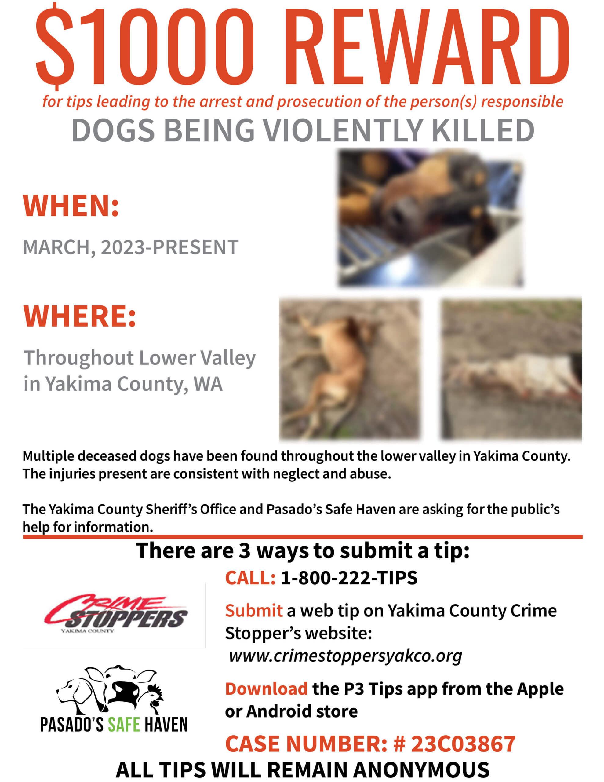 The Yakima County Sheriff’s Office and Pasado’s Safe Haven are asking for the public’s help with any information. There are three ways to submit a tip: